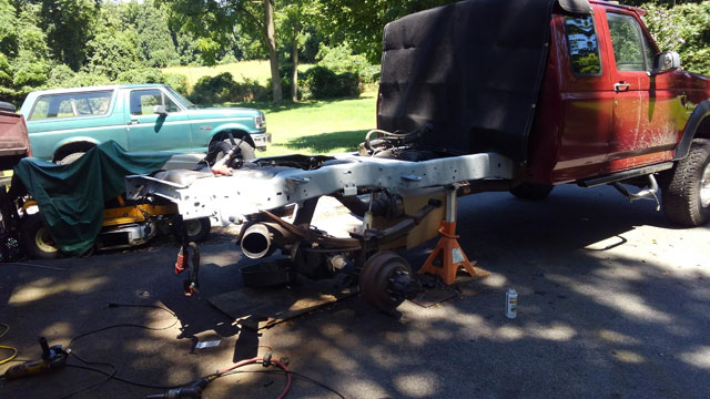 So lets talk about that hinge. This is how its designed. One bracket that bolts inside the frame, one that bolts to the bed, and a 5/8 Gr8 bolt for a hinge pin Frame side bracket. Not thrilled with this piece. The bushing is a nut with the threads drilled out, but its oversize so the bolt is sloppy Bed-side bracket. has this angle iron tab that extends forward to tie into the next forward bed xmember. Good idea, but it doesnt fit on the 92-97 bed, so its gotta go so here's the new bed half. Not a fan of this as the hole on this is also oversize so the bolt is sloppy. At this point i figure i had two options. Use their hinge and upgrade to a 3/4" bolt for a hinge pin, or just build my own hinges. So i looked it up. According to this page, a 5/8 Gr8 bolt has a shear strength of 27,920lbs! Clearly i dont need a 3/4" bolt for the hinge, and the 5/8 will fit in the space better. So i guess im making new hinges! Ok, gotta make some spacers. Carbide holesaw in 3/8" plate New hinge, with spacer welded in place. All 3/8" Installed on frame. Unlike theirs, mine uses all existing holes in the frame. Also of note, i need to finish trimming the frame. That notch is required for room for the hinge to pivot. Both made ...and the comparison between mine & theirs. IMO, mine is far superior. So now i need to build the bed-side half of the hinge. Well, i scrounged up some more 3/8" plate that im going to use to build them this week. I really liked the idea of making the hinge double shear, but there just isnt any room under there to do it with the hinges built as such; i might have to make a second spacer to weld to the inside of each frame-side hinge, but these will most likely need to be 1/2" in order to space them far enough away that they will not interfere with the bed bolt. So my goal for next week is going to be to finish the hinges, as long as mother nature cuts me some slack! One thing i want to say. Im not trying to bash on Pierce-Arrow. These guys have been building these kits for, as far as i can tell, 15-20 years, and everyone loves them. No complaints from anyone on the parts that ive found, which tells me that if their sloppy single-shear hinge is good, then mine will be better. Also, it doesnt have to be double shear, but if i can i want to do it, just cuz i can. The scissor for the hyd cylinder seems like a nice piece, as does the pump, and the wiring & hardware kits are both nice as well. So basically, my only complaint with it is the hinge, which will soon be resolved. So i have a small update: rain sucks. It wont stop! We got ~12" of rain last week, with more coming next week! So i do have some real progress, but thanks to mother nature its been slow. Youre probably wondering why i lifted the bed to do all that work, when i couldve done it all w/o removing it. Well, it has something to do with this: Youre looking at a 2ton hydraulic dump conversion kit. It converts the stock truck bed into a covert dump bed, which is pretty awesome. Bought it last fall and with working on the green bronco never got around to installing it until now. It came with a ton of Gr8 hardware a whole bunch of wires, connectors, 200a circuit breaker, hydraulic hose & fittings, all sorts of parts the pump is a pretty nice piece, and has a built in 3qt reservoir. Its designed to run on ATF which is convenient. So here's where i goofed. This kit is a 'universal' kit because it fits like 20 years of these trucks. As i later discovered, there was a specific kit available direct from the manufacturer (Pierce Arrow, Inc) that wouldve worked better, but oh well. The primary difference is in the hinges, anyway, which ill get to in a moment. So i need to notch the end of the frame for clearance for the hinge. This is the point of no return, as im also cutting off the hole for the rearmost bed bolt. So today the rain broke long enough for some buddies to swing by and help set the bed back on the frame so i can begin! New spring hangars from Dorman Installed new spring bushings as well Made a new tailpipe hangar to replace the broken one ...and a new trailer hitch! Curt Class V, #15300. Got it on RockAuto for $180, cant beat that price for a class V hitch. And it is BEEF too, really nice heavy duty hitch. That pretty much gets me up to date, as it has been pouring non-stop for days now. I still need to fix the trailer hitch wiring as i damaged it when i removed the bumper (doh!) but aside from that the repairs are done, which means as soon as the weather improves, the mods can begin! So now that the bed is off, the maintenance can begin. #1, rear tank runs out of fuel at ¼ tank. Pulled the sending unit and sure enough, the strainer has broken off the bottom! Pulled the front sending unit because it always read empty, and found a cracked float full of diesel (float already removed) Sending units for the diesels are pretty pricey, but fortunately, parts are not! So i ordered a new float for the front, and strainer for the back off Amazon, and got them both fixed Next up was to remove the front spring hangars as they are toast From there i needle-scaled, wire-wheeled, and then primed the whole back half of the frame And then yesterday i finally got a coat of paint on it! Woah an update! So here we are, 3 years later. Everything still works! Sort of, anyway. This thing needs some TLC tho, so here we go!! Step one, remove tailgate & bumper: Step two, remove rotted out, worn out trailer hitch: Locate bed bolts in bed liner (this part sucks) This one was particularly stubborn, had to cut bottom of bolt off. They have an interesting shoulder on them so as to not crush the bed when torqued down; also means they must come out the top even when the head is cut off. Front-left bolt. Another stubborn one. This one i had to cut the nut off with a die grinder, due to how close it is to the fuel & brake lines This is a fun job to do. 5 out of 6 bed bolts fought me, and ended up getting cut. Im still going to have to deal with this later! S